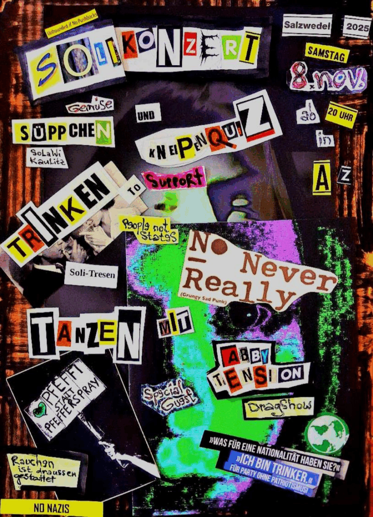 Englisch | Persisch | Französisch | Türkisch | Ukrainisch | Arabisch | Russisch | Kurdisch (Kurmandschi) untenSolikneipe! Unbounded Solidaristi goes AZ! Am 8.11. ist es wieder so weit: Wir machen Kneipe – solidarisch, laut und lecker.Einlass ab 20 Uhr im AZ Kim Hubert, Altperverstraße 32/34 in Salzwedel. Es gibt feinstes Süppchen, eine wärmende Feuertonne und natürlich jede Menge gute Leute.Beim Kneipenquiz könnt ihr euer unnützes Wissen glänzen lassen – oder einfach nur wild raten. –> Auf der Bühne: No Never Really – live ab 21:00 Uhr–> Danach our special Guest: Dragshow mit Abby Tension – Glitzer, Drama, Überraschung! Kommt rum, […]