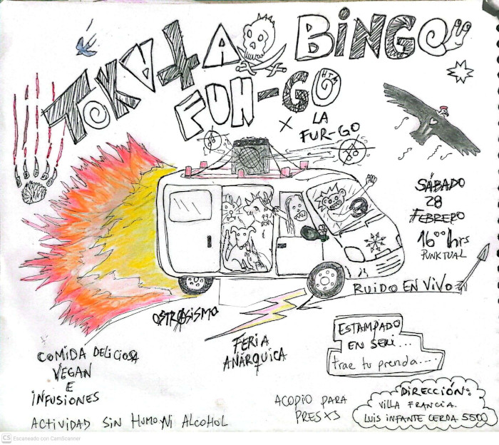 Les invitamos esta tokata-bingo, para mantener activa la fur-go, vehiculo que nos ha permitido movilizar y levantar diferentes inicitivas solidarias, y que ha estado a disposición de inumerables situaciones apañando desinteresadamente. Apoyo mutuo para potenciar nuestra inquitudes… Sábado 28 de febrero 16:00 horas (punktual) Elefante Blanco (Luis Infante Cerda 5500, Villa Francia) – Juegos de bingo premios hermonstruos donados por gente hermonstrua. – Ruido en vivo – Bandas por confirmar – Comida deliciosa vegan – Bebestibles e infusiones Actividad sin humo, ni alcohol. Salud y (A) via Boletín de la Biblioteca Anárquica Nihil Sebastián Oversluij Seguel