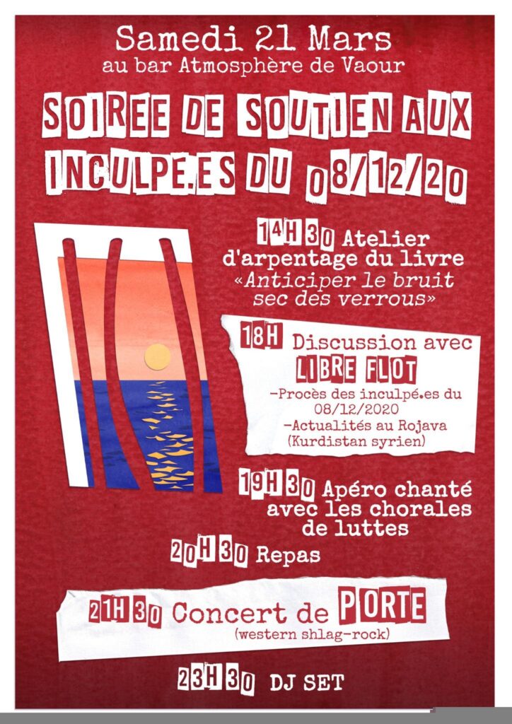 🔥Soirée de soutien aux inculpé.es du 8 décembre au bar Atmosphère de Vaour (Tarn 81), le samedi 21 mars 2026🔥Au programme :14h30 Atelier d’arpentage du livre « anticiper le bruit sec des verrous »18h Discussion avec Libre FlotLe procès des inculpé.es du 8.12L’actualité au Rojava (Kurdistan syrien)19h30 Apéro chanté avec les chorales de luttes20h30 Repas21h30 concert de Porte (western shlag-rock)23h30 DJ set
